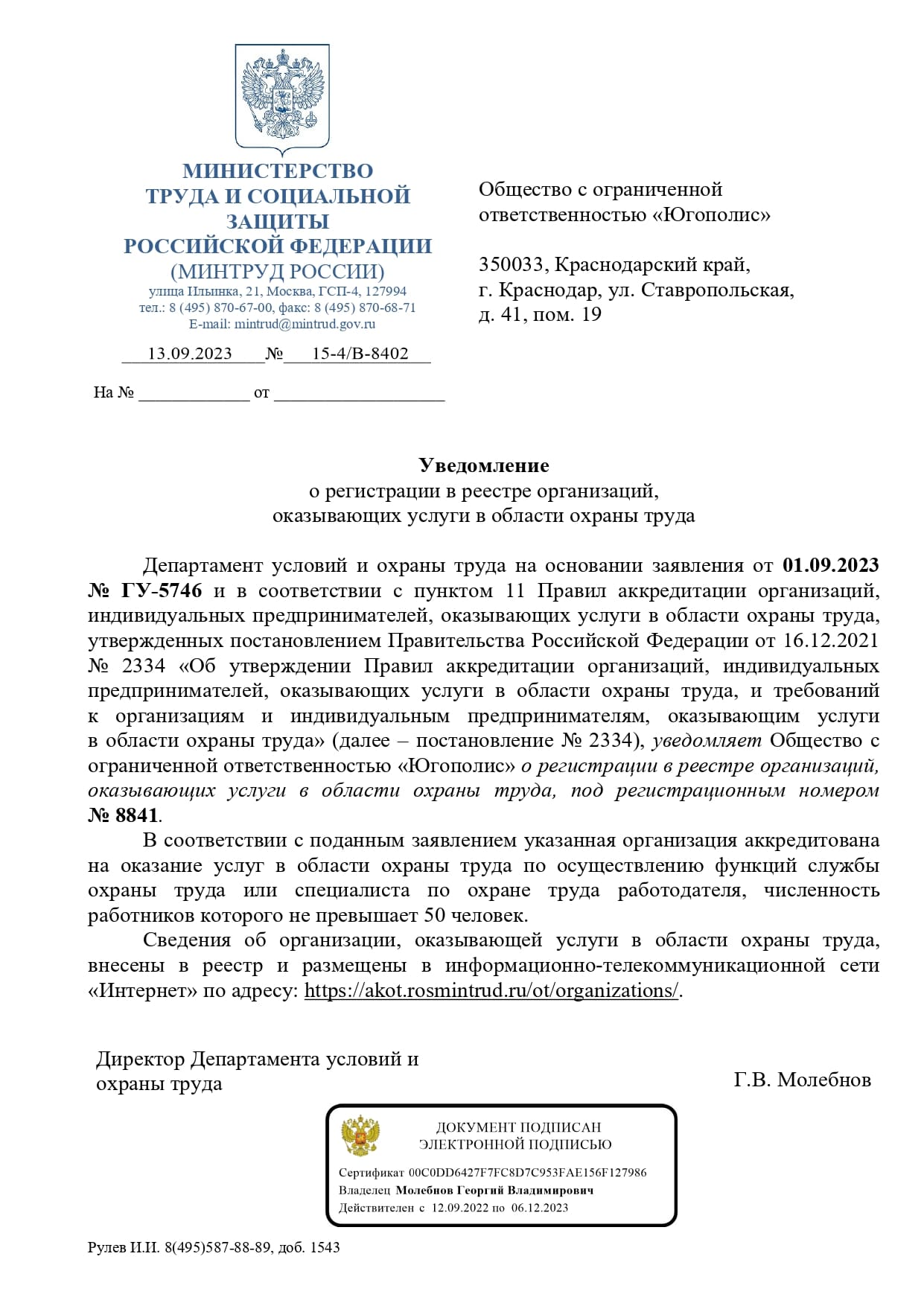 Уведомление о регистрации